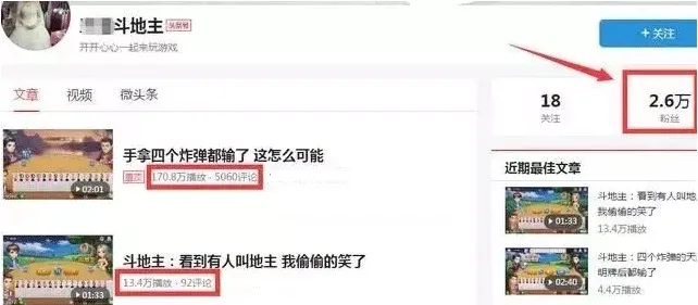 以原创视频,最低收入1万播放12元来算,这个寥寥数语+自己斗地主顺手录的视频,170.8万播放量,收益2049.6元!!这是什么概念,这是玩着玩着就把钱赚了,妙哉! 你看,斗地主、打麻将的小白也能崛起,成为别人仰视的存在,别人能做到,你为什么不能呢? 今天就给大家聊聊这个网赚项目——在头条上利用斗地主、打麻将打造赚钱IP! 1、案例分析 要知道,很多人都有自己擅长和喜欢的东西及领域。在这个自媒体盛行的时候,这些都是可以加以利用来赚钱的,业余时间操作这样的网赚项目,可能比自己上班的工资还要高。