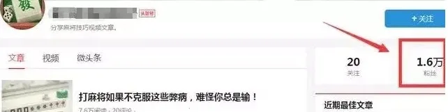 看看开头说的例子就知道了。这个头条号就是把手机玩游戏的过程录屏下来,挑选一些比较精彩的,发布到自媒体平台上。 这个头条号发的视频,视频平均的播放量基本上都是在上万左右,粉丝量也是迅速增长到了2.6万! 让我们再看看另一个打麻将的例子: