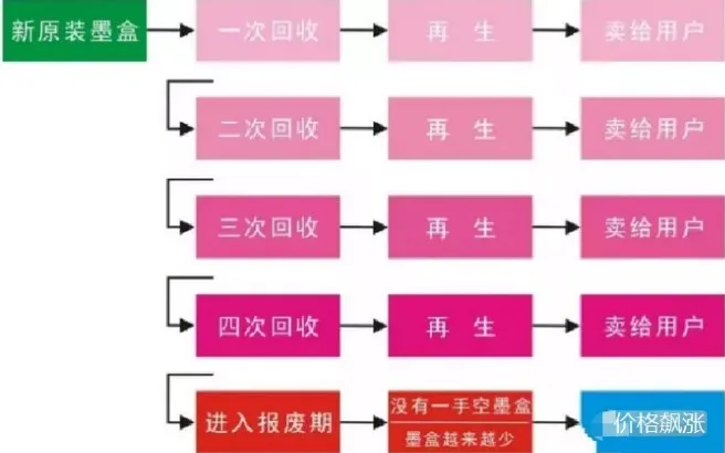 现代墨盒主要指的是喷墨打印机中用来存储打印墨水,并最终完成打印的部件,因为墨盒用时间长了会出现打印不清晰、断点、断线等故障,所以要经常更换。 而其实目前市面上很多新的墨盒又是通过这些回收的墨盒翻新之后再卖的,你看下面这张图就明白了为什么有那么多回收墨盒的了。